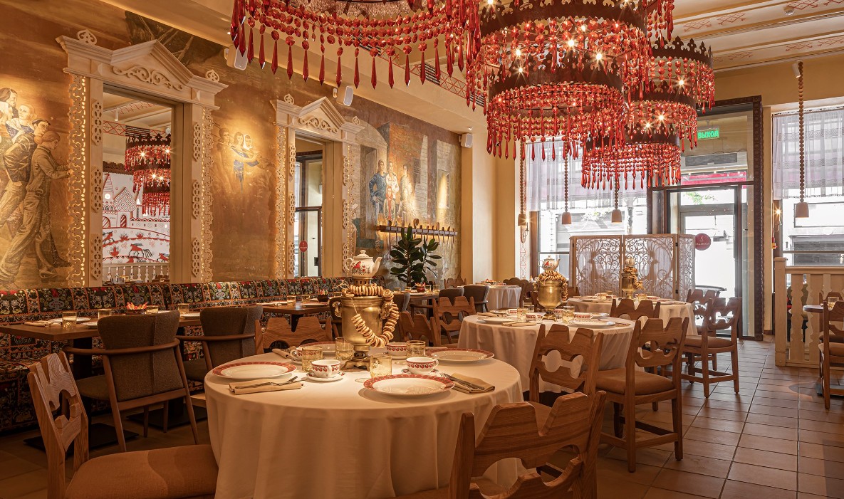 ภายในโถงหลักของร้านมี เตารัสเซียแบบดั้งเดิมและเตาย่างไฟเปิด ที่ใช้ปรุงอาหารต่อหน้าลูกค้า เพิ่มเสน่ห์และความมีชีวิตชีวาให้กับบรรยากาศการรับประทานอาหาร